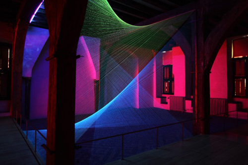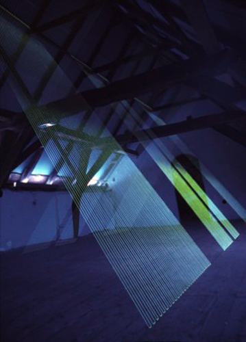Large scale interventions in both nature and the built environment using phosphorescent threads and differing light sources from sunlight to LED from laser to tube light. Recent work has moved from static to responsive as the spectator plays an active role in discovering and revealing the work.